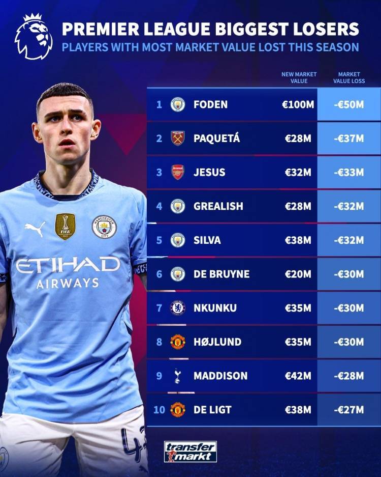 直播吧6月3日讯 德国转会市场列出英超球员本赛季身价下滑排名,福登身价下降5000万欧最多,帕奎塔下降3700万欧次席。
